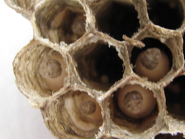 Но самка другого вида всё-таки основала гнездо. Правда, тут была маленькая хитрость с моей стороны: в жилище уже было приклеено старое гнездо полистов, которое незамедлительно было исследовано и признано годным.