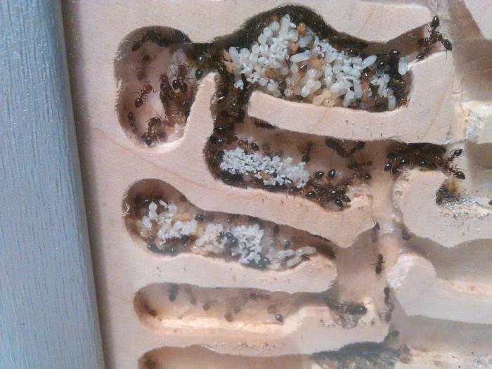 Форм для кремов действительно великоват, даже для развитой семьи, его можно отложить на пару лет, я так думаю. По первости муравьям хватит пробирки с ареной, потом небольшой формикарий и т.д. В вертикальном формикарии камеры нужно делать не в высоту как у Вас, а больше в горизонтальной плоскости. Эффективная поверхность это пол камеры, на стенах будут сидеть муравьи, на стекло будут клеить личинок, но основная часть расплода будет на полу, остальной объём камеры будет пустовать. Кремотогастеры не любят крупных камер, им лучше небольшие и длинные камеры в виде переплетающихся ходов, вроде корней арахиса. Хорошо подходит расположение камер как в губке, много не крупных камер соединёнными небольшими ходами.