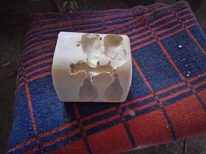 Возникла проблема также с вытаскиванием гипса. Сколько я только не стучал резиновым молотком, всё равно гипс сидел на месте. И вот по совету jabacrack-а я поставил ёмкость с гипсом в ведро с горячей водой и подождал примерно 9 минут, убрал ёмкость и начал постукивать. Я очень удивился, т.к. после третьего удара гипс сразу вылез. Пластилин я вытащил уже.
