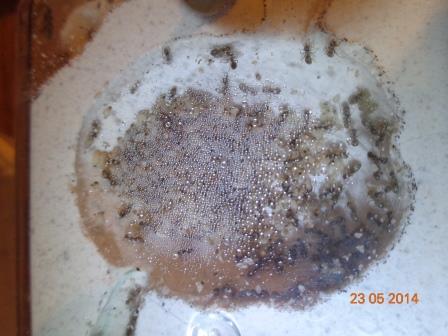 Поместив формик с открытой ареной в таз, а тот в ванну с водой (чтобы не разбежались), я раскрошил в тазу земляной ком с муравейником. Вход в формик муравьи нашли довольно быстро. Прошвырнувшись по новому дому разведчик, назовем его Моисеем, рассказал об этом остальным, и они начали таскать в формик приплод и самцов, которых оказалось на удивление много. Я оставил их в покое, поэтому не увидел, как в формик конвоировали маток. Их оказалось две. Я с самого начала переживал, что в процессе переселения матка может погибнуть, и тогда все потеряет смысл, но обошлось.