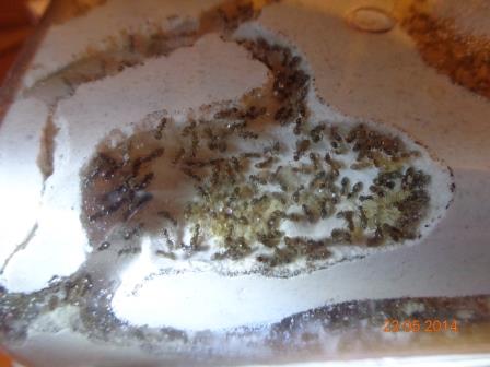 Утром я закрыл арену, и те, кто еще продолжал бегать по грунту и стенкам таза, пролетели – в большой семье клювом не щелкают. Впрочем, я и не рассчитывал, что сохранить удастся всю семью. Колония оказалась довольно многочисленной, и заняла все камеры, и даже ходы, разложив в них личинок.