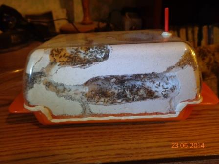 Для формика я купил попавшуюся на глаза масленку для сливочного масла. Уже по возвращению домой я понял, что с заливкой будут проблемы, поскольку две части масленки соединялись не в одной плоскости, а по изогнутой в трех плоскостях кривой, а дно было непрозрачным, поэтому должно было оставаться дном. Искать новый сосуд я не стал, а проблему решил, загерметизировав стык пластилином и просверлив в дне отверстие для заливки гипса.