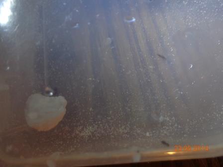 Во-вторых, стенки формика сильно запотели, и к каплям поприлипала куча коконов. Боюсь, что они погибнут. С увлажнением завязываю. По этой причине, и по причине того, что камера увлажнения уже обжита – не топить же их. Надеюсь, что влаги на ватке в арене будет достаточно, и муравьи сами ее распределят, как им надо, а имеющееся переувлажнение самоустранится через вентиляцию.