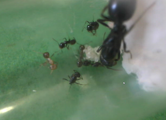 Все шесть мурашей "первого поколения" активно ухаживают за маткой и приплодом.
