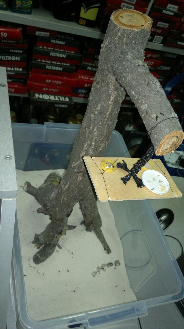 Затем нашел треногую ветку и поставил ее прямо на муравейник, а на верху этой ветки поместил кормушку.