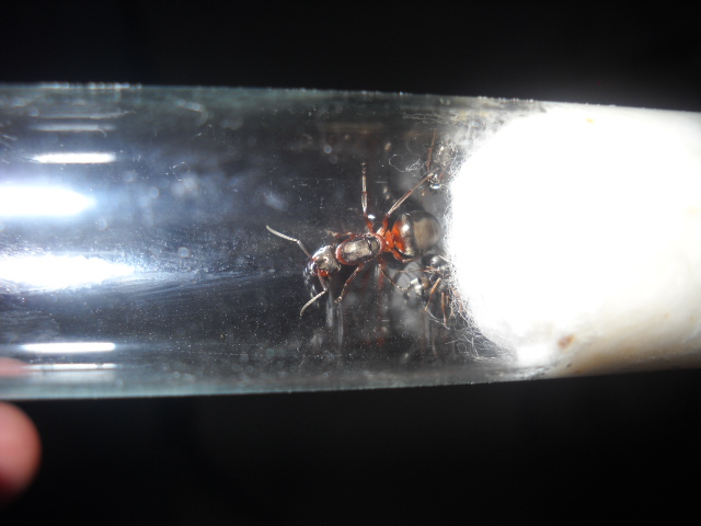 Здравствуйте господа мирмикиперы. Ничего не понимаю. Погода у нас стоит так сказать не "лётная". Днём 12-15 градусов ночью 3-5, дожди через день да каждый день. Смотрел по лёту муравьёв, в это время должны лететь у нас формики живу я в Новосибирске, но как уже говорил погода не "лётная". Не выдержал. Дождался солнечного дня и решил сьездить в лес. Было солнечно градусов 15-17, до этого днём шли кратковременные дожди. И как говорится не зря сьездил. Нашол две матки Serviformica rufibarbis ,на следующий день у обоих было по пакету яиц (шт по 10-15) Ещё нашол две матки Formica polyctena или rufa не могу определить. Если подскажите буду рад))) Сразу по приезду домой подсадил к ним по 6 рабочих фусок, предварительно окунув их в воду. Всё хорошо, уже 3 дня сидят мирно пьют разбавленный мёд, кормят маток,естественно в разных пробирках. Кстати самцы попадались и крылатые матки,но мало. И хочу посоветоваться можно ли им сейчас подкинуть коконы?И ещё поймал матку вид которой затрудняюсь определить, она уже отложила штук 5 яиц. Подскажите пожалуйста, что за вид ?