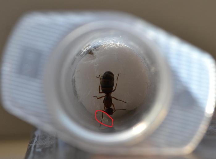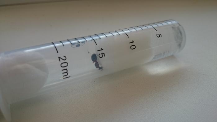 Кстати, помните я говорил про ту, крылатую матку? Так вот, она сбросила крылышки. Я решил провести эксперимент над ней, не волнуйтесь, он не такой жестокий :) Просто я поймал муравья-рабочего,Посадил в пробирку, аккуратно заполнил эту пробирку водой до краев и завинтил крышечку. Спусти некоторое время я выложил мурашика на ватку и накрыл пробиркой, что бы не убежал. А после того как он очухался, присоединил пробирку к шприцу с маткой. И наглым образом вытряхнул его к матке.