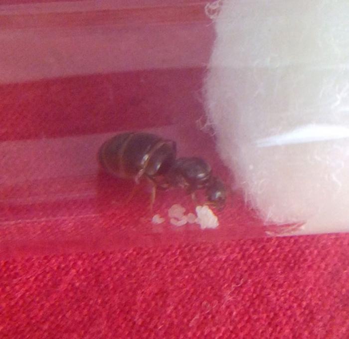 Сегодня решила проверить, как проходит знакомство. Двое сирот, отправленные на арену к местным жителям, пали жертвой объединения народов. Начинаю сомневаться, так ли хорошо идея объединить две семьи. Читала, что потерявшие матку колонии хорошо принимают новую королеву. И как муравьиный бог послал, иду по улице сегодня, вижу - ползет, красавица. А у меня с собой (конечно, чему еще быть в дамской сумочке) новый формикарий из под коробки рошен. И недолго думая над последствиями сего действа, так как иной тары не было, запихнула королеву в коробку. Она, довольная, шнырь по арене и бегом в камеры. Прошлась по апартаментам, оценила.