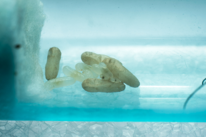 Сделал классический инкубатор и напрямую подсоединил его к поилке. Матке это жуть как не понравилось и она с диким рвением пол часа пыталась грызть пробирку. Через пару часов погрызывания всего вокруг и исследования нового дома она таки перенесла яйца и коконы на новое место. На следующий день я устроил ей фото сессию. вот что получилось.