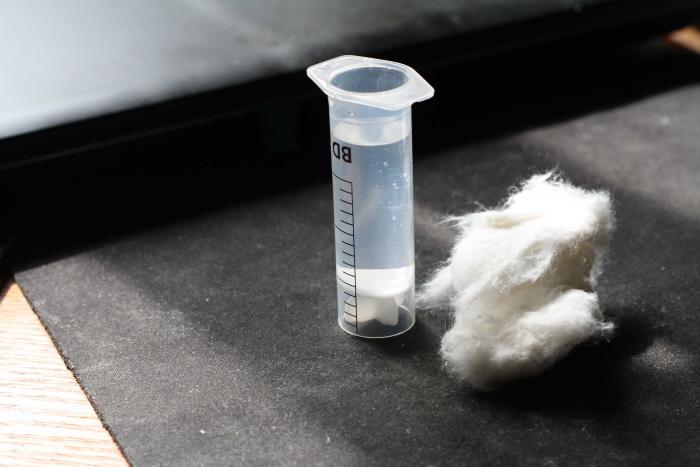 4. Ватка коснулась воды. Продолжаю спокойно пропихивать дальше наблюдая, как она промокает. Это хорошо заметно сквозь стекло пробирки. Как только она промокла полностью - остановился. Излишки воды, если просочилась, удаляю ватной палочкой.