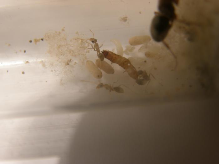 Всем доброго времени суток.Примерно месяц назад,чуть больше, мне знакомый принёс матку сервиформики,предположительно руфибарбус.Примерно в то же время я поймал ещё несколько похожих маток,но у этой мамаши брюшко было как "зад у хорошей женщины" )))) раза в два больше чем у других.Яйца появились на следующий день, после прописки у меня в квартире.Ну а следом личинки и коны.Тут она меня и заставила понервничать.Распечатала раньше времени коконы и в инкубаторе лежали голенькие,беленькие,неподвижные мураши,как результат неопытности,ПАНИКА.Начал писать всем кто был онлайн,а конкретней (S.T.E.L.S.-у,Filin-у и Raf-у)от них и получил успокоительное))).Спасибо вам за помощь!!!А сегодня появилось и трое рабочих.Пришлось погонять их лампой,чтоб сделать пару фоток.