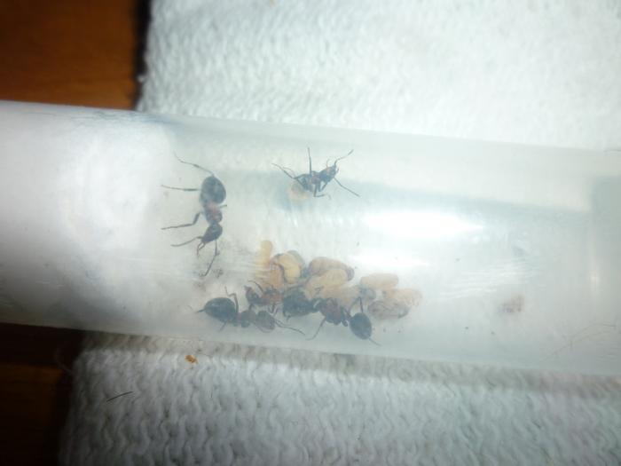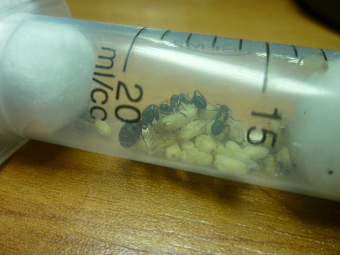Одна из семей уже переселилась. Вот достают нового муравья. Скоро добавлю ещё 1 секцию шприца.