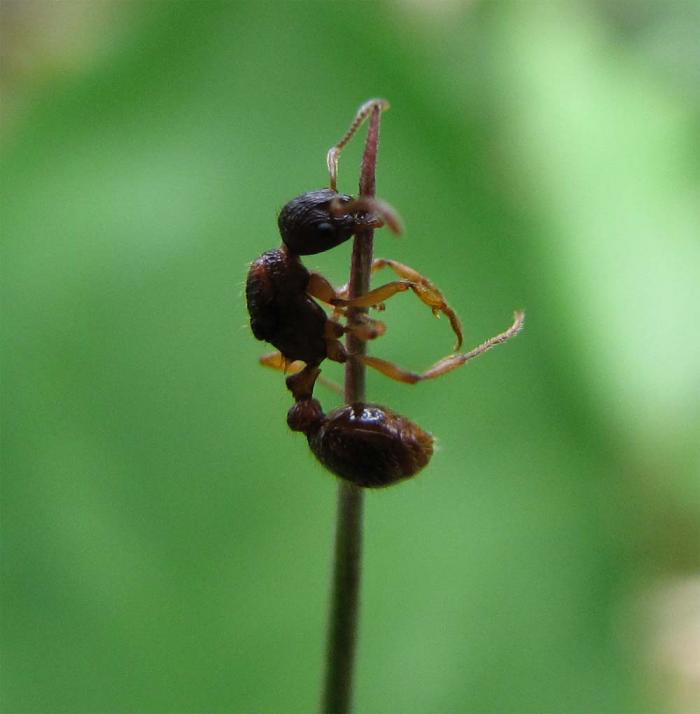 Зараженный ланцетовидной двуусткой муравей рода Mirmica на молодом побеге бамбучника в долине реки Саратовская, заповедник «Курильский». Автор фото: Лариса Сундукова
