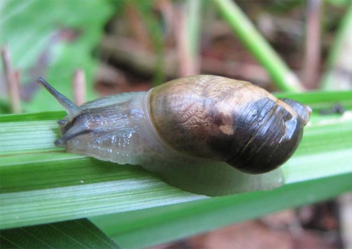 Улитка Succinea lauta из семейства Янтарки - наиболее массовый вид и вероятный промежуточный хозяин ланцетовидной двуустки в долине реки Саратовская. Автор фото: Лариса Сундукова