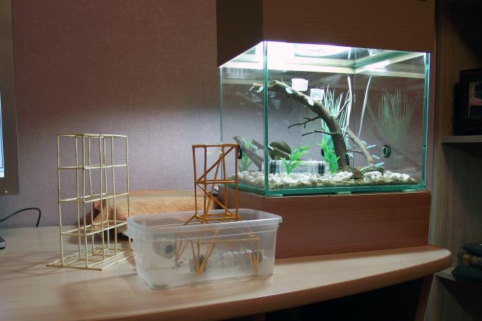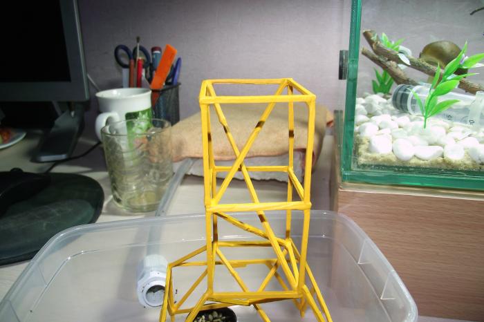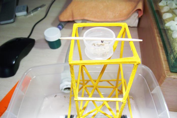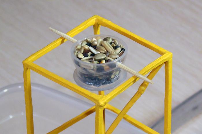 В ходе эксплуатации разместил на верхнем «этаже» кормушку с семенами (зубочистка + колпачок от 0.5 литровой бутылки). В дальнейшем думаю создать новую башню с размещенной поилкой, но поскольку поилка обладает существенной массой процесс создания устойчивой и интересной конструкции затягивается.
