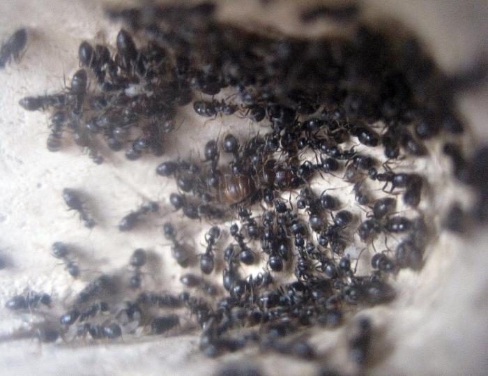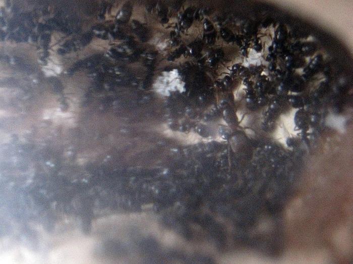 В начале июля поймал самку лазиуса умбратуса. И подумал: " А что, если мне не завести их? ". Потом я самке подбросил коконов штук 40. После того, как в пробирке им стало тесно, я переселил их в формикарий. Потом я постепенно увеличивал численность рабочих нигеров до 200. Самка отложила яйца в 20-ых числах июля, понойму, точно не помню. Личинки уже появились. Но их ещё пока что штук 50, но будет ещё на много больше. Думаю, что в начале октября буду их уже вводить в диапаузу. Т.К. я думаю, что все яйца к началу октября уже превратятся в личинок. Когда самка неслась усиленными темпами, у неё была физогаситрия( фото прилагается). Сейчас самка стройна. Фото прилагается: