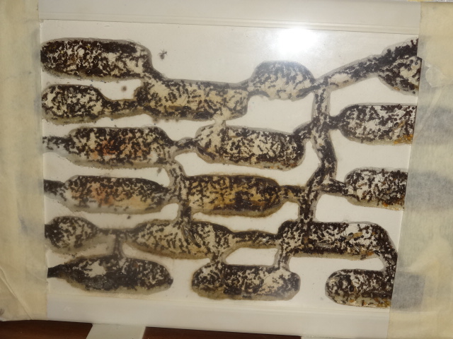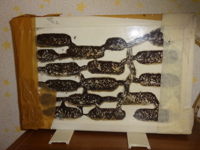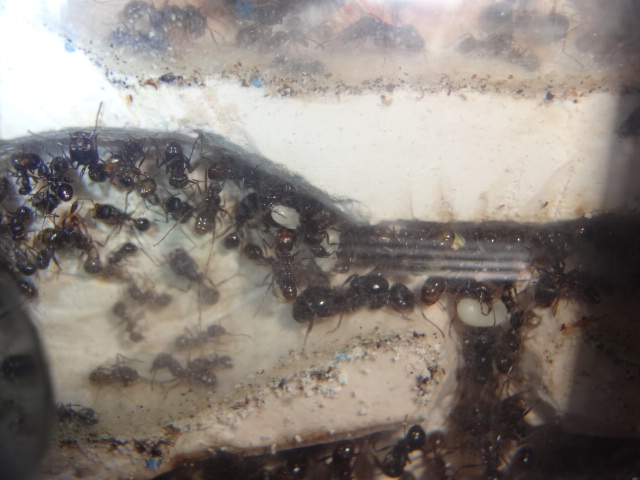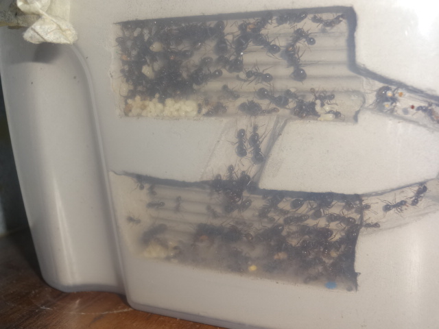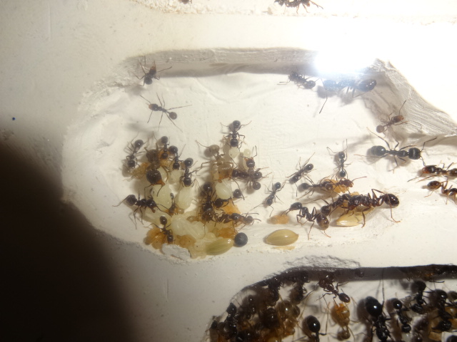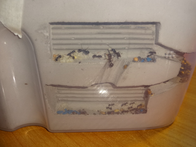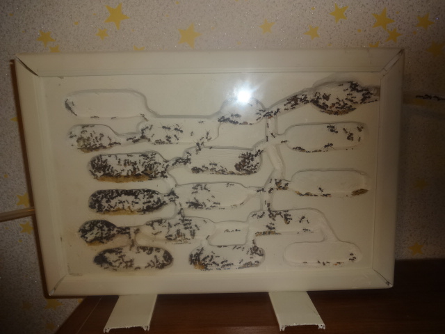 Колония растет и радует своей плодовитостью, но и убегают с арены в 2 счета, не помогает даже 10 сантиметровая полоска с литолом. Переселил в новый формик, так как случился демогрофический взрыв, на фотографиях ниже вы это увидите))) В новом форме, они начали грызть вентиляцию, сетка, то прочная, но вокруг нее гипс... Я знаю вы не любители читать, так что вот фото =)
