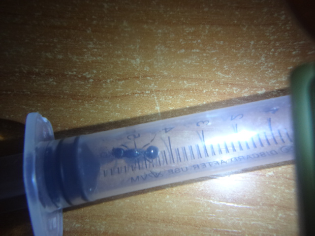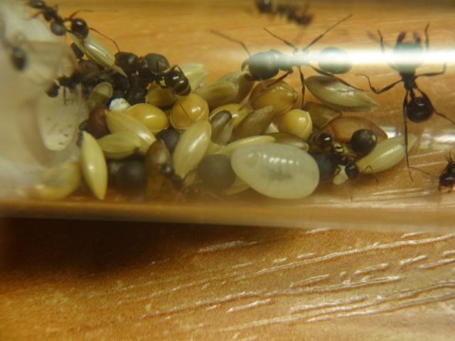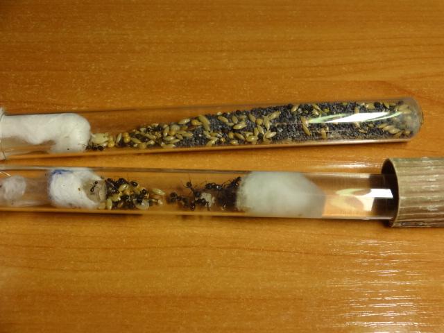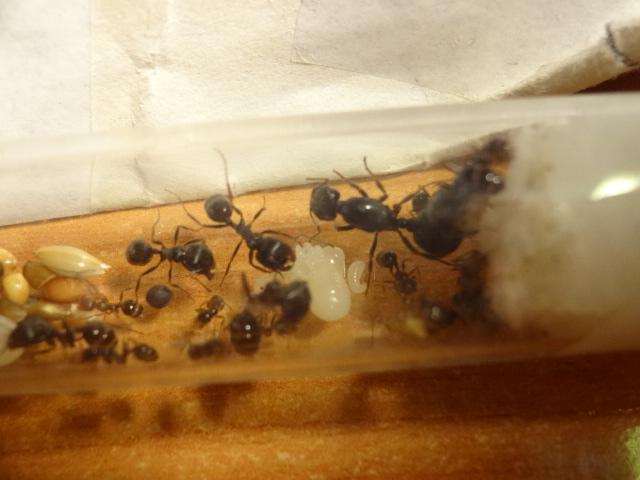 Начнем) Когда матка приехала не было не яиц,не личинок... Стресс... Насыпал корм для попугаев Вака и мак на арену, все перетащили во вторую пустую пробирку (типо склад). В данный момент количество возрасло, мураьев стало около 30) Выхаживают кормовых личинок до размера бочки (в кормовых личинках много питательных веществ), еще имеются 5 солдат которые вообще не выбегают на арену) Фотки качеством страдают,извините....