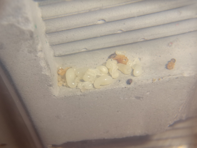 Кормовых от личинок солдат отличить довольно просто, мне старый знакомый рассказал, теперь не путаюсь. Кормовая- это очень сильно(как яблоко или очень большая груша)непропорционально раздутые личинки, а вот личинки, из которых появиться солдат, они большие, но пропорции личинок соблюдены. То есть личинка солдата выглядит просто как очень большая личинка рабочего.