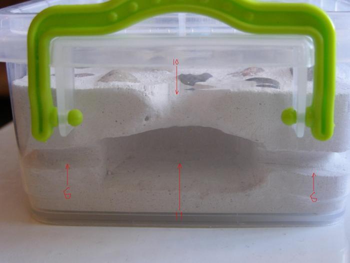 Контейнер для продуктов, размерностью 10.5см на 14.5см. Плотно закрывается ручками. На верхняя крышке находятся: мелкие вентиляционные поры по периметру(1), большая вентеляцийна сетка ближе к входу(2), кормушка(4) с задвижной крышкой(3) и отверстие для трубочки увлажнения(5), которая открывается на дне формика в увлажняющий канал по центру(9). В алебастровой заготовке вырезано 5 камер глубиной в 2-2,5см соединенных каналами(6), последние две камеры запечатано(7) алебастровым пылью и водой образовавших пломбу, которую с легкостью разрушат Мессоры при попытке расширить жизненное пространство колонии. Вход(10) в главную камеру(11) проблематичен, нужно 2см проползти по потолку.