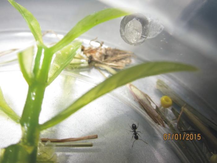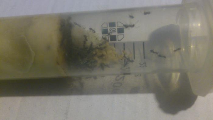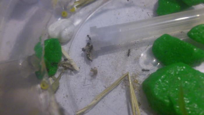 Весь расплод из модуля был аккуратно перенесен живой королеве и там разложен по всему жилому помещению. Туда-же было добавлено углеводное питание и несколько тушек дрозофил. Потом в модуль были перемещены все рабочие. Я решил, будь что будет. И судя по ситуации имеющейся на данный момент - не прогадал.