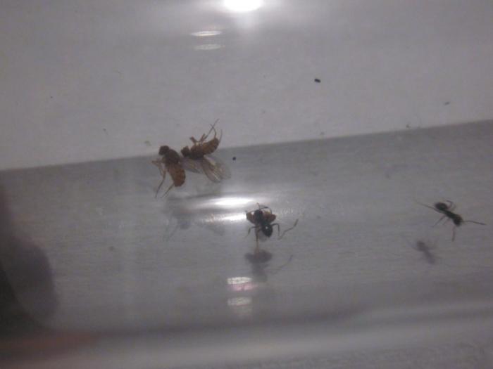 Внимательно осмотрев модули и посчитав численность я понял, что в этой своре еще минимум шесть рабочих из семьи живой королевы. Но не похоже было, что там продолжался какой-то конфликт. Поведение было несколько оживленное, рабочие постоянно ощупывали друг-друга усиками. Некоторые покусывали друг-друга, но это было не похоже на атаки, скорее на какую-то чистку. Особь, которую покусывали, замирала без движения, а после "ритуала" спокойно удалялась по своим делам. И не смотря на то, что некоторые особи иногда угрожающе подпрыгивали, было принято решение действовать радикально.