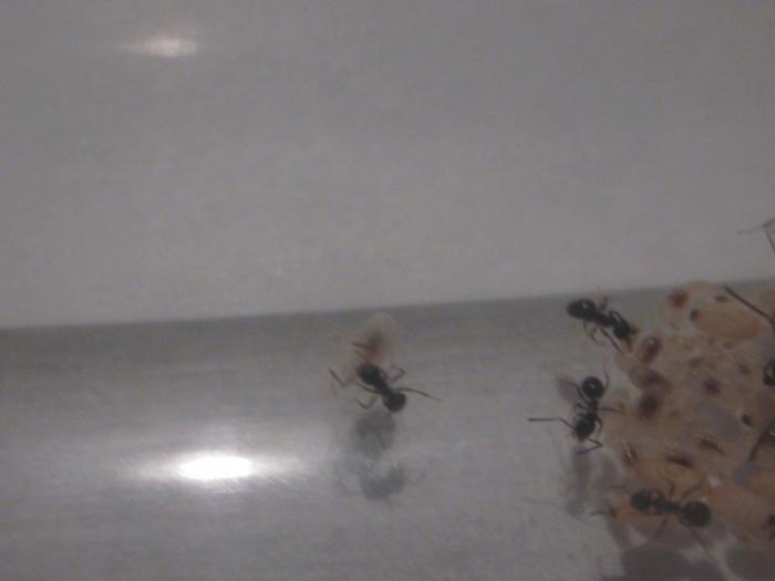 На данный момент все заняты делом. Матка спокойно сидит на кладке. Весь расплод собран в одну кучу и большая часть рабочих сейчас занята его обработкой. Конфликтов не наблюдается. Изредка замечаю "ритуальную" чистку, но думаю это не страшно. Во время подселения погибло четыре работника, расплод визуально не пострадал. Дальше буду действовать по ситуации
