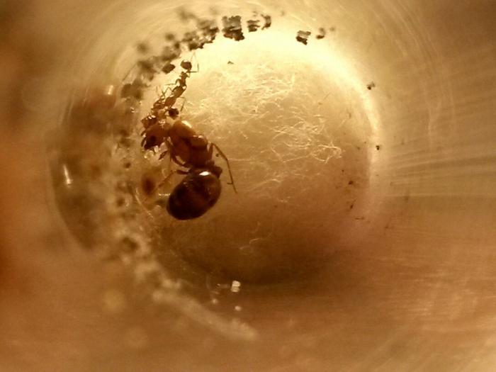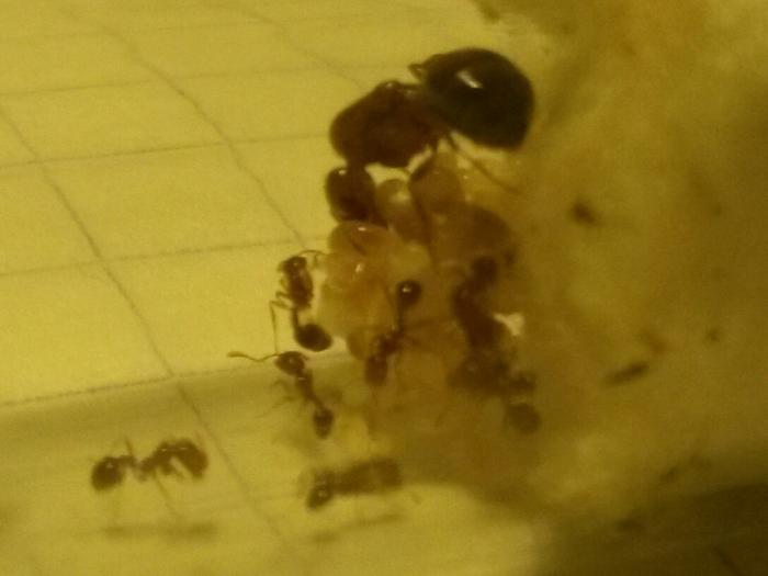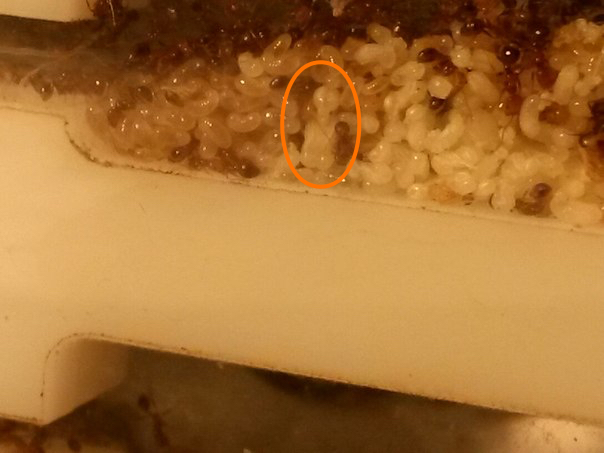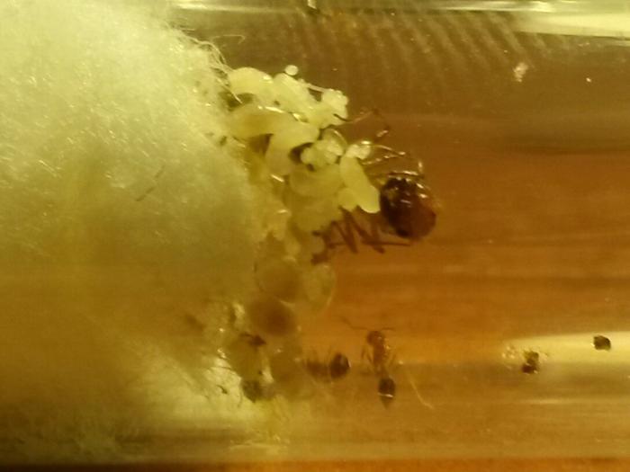 Состав колонии на сегодня : матка , трое рабочих ,около 9-11 личинок и пакет яиц .