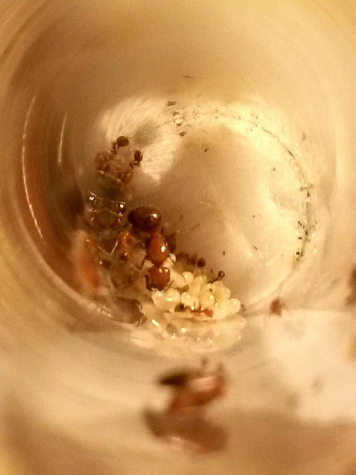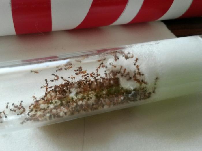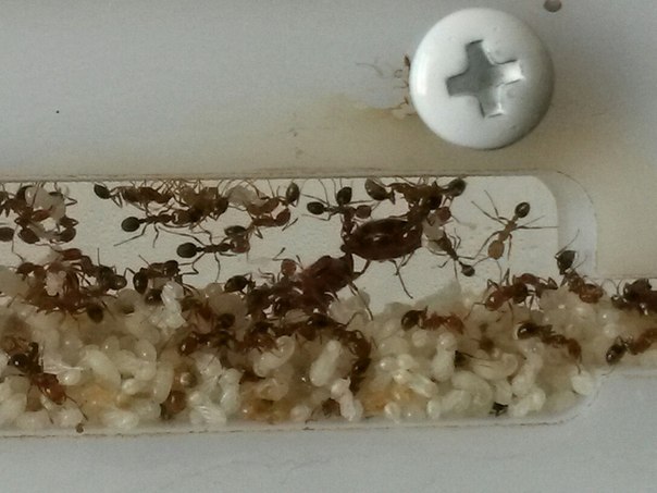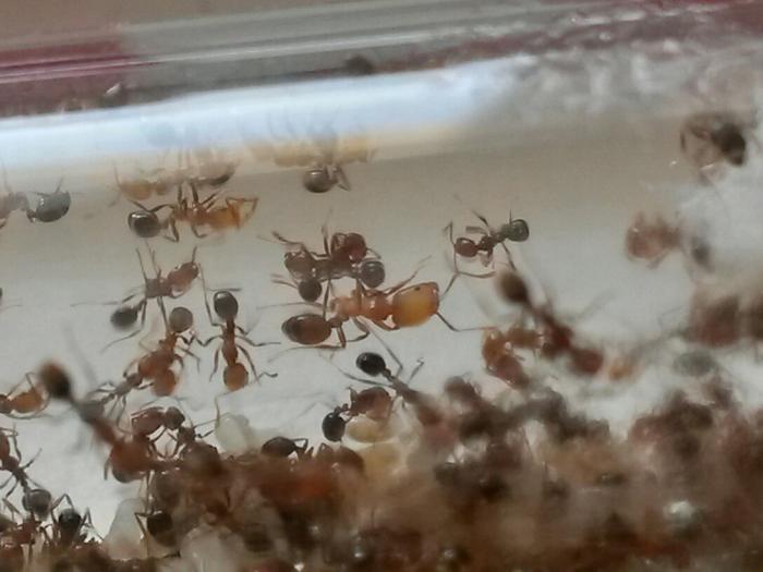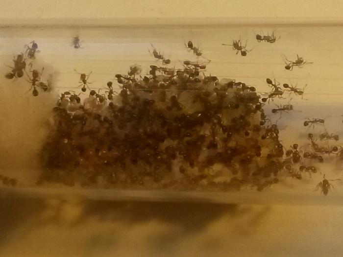 Муравьи приехали в маленькой пластиковой пробирки (5 см).Состав : матка , 7 рабочих , личинка . И потом 5 рабочих умерло . Но теперь их вместе с маткой - 4 шт .