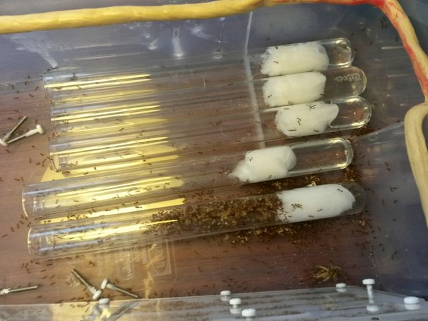 Муравьи приехали в маленькой пластиковой пробирки (5 см).Состав : матка , 7 рабочих , личинка . И потом 5 рабочих умерло . Но теперь их вместе с маткой - 4 шт .