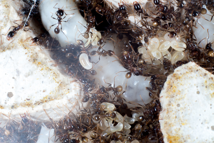 Да, верно. Первое время они откладывали яица и разбрасывали их по пробирке, как матки паразитов. Т.е. никакого ухода не было. Сама матка австралиса по своей морфологии не похожа на муравья, который выращивает первое поколение сам - нет у них никаких жировых запасов. Возможно в природе они основывают семьи делением. Тогда сама она ничего не вырастит, поэтому я дал ей куколку дайвса. Потом, как показала практика, они все же растят расплод сами, но их надо регулярно подкармливать, иначе будут этот же расплод съедать.