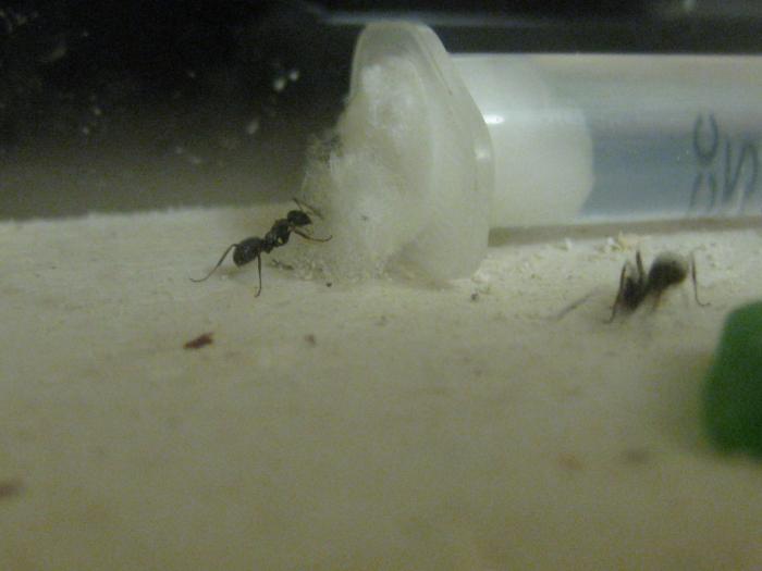 Допустим это она! Как их содержат?Конкретного не нашел. Следующий вопрос, почему матка не лезет в пробирку,устроилась на входе(свет не смущает) там же и кладка(приличная 3*3 мм),пробирку используют вместо поилки(влажность не устраивает?),а из поилки на арене активно выдергивают вату и тащат под нее вместе с остальным мусором.Решили что-нибудь построить наверное.Поделитесь мыслями!