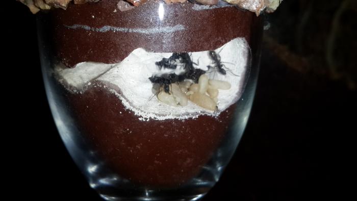 Итак прошло некоторое время и можно сделать небольшой отчет. Муравьи как я вижу чувствуют себя очень даже не плохо, расплода прибавилось очень ощутимо, пакета 2 яиц по штук 8-10 и штук 5 личинок и 10 куколок и это за относительно короткий срок. Кушают они как маленькие слоны, не успею налить сиропа как они его весь выпьют и сидят ждут следующую порцию, туркмена выедают примерно за ночь (размер тарика не очень большой) на утро на поверхности лежат кучкой остатки.