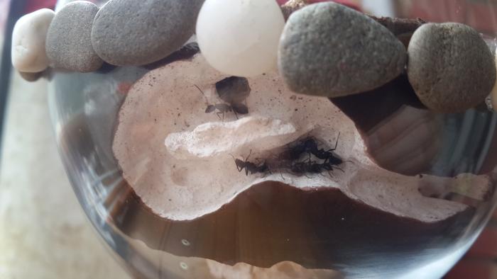 Переселение прошло очень быстро, колония сейчас уже адаптировалась и ведет свой полноценный образ жизни. Сам формик делался относительно легко (правда 1 бокал все таки полетел в мусорку) в бокал заливался гипс, потом бокал разбивался, доставалась болванка (красилась акрилом), выпиливались ходы и тут самое интересное, так как бокал имеет сужение у горлышка его пришлось разрезать пополам, после чего в него вставлялась болванка и потом бокал склеивался обратно. После проветривания на балконе пару дней можно было спокойно переселять мурах.