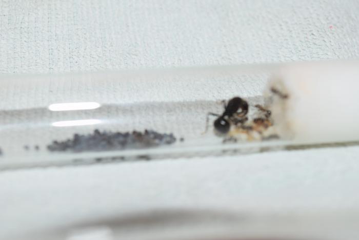 Всем привет. Полтора месяца назад приобрел матку Мессоров в пробирочке. Матка пришла ко мне уже с отложенной пачкой яиц, теперь яйца конечно прошли все свои стадии развития и из куколок появились первые муравьи. Насыпал в пробирку немного мака, они разбросали его по всей пробирке и я просто не могу понять едят они его или нет. Чем можно подкормить Мессоров на данной стадии развития семьи?