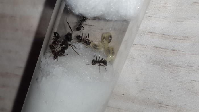 П.С. Не знаю нова или не нова, а может и вообще не имеет значения, но я в момент подселения рабочих к матке решил ватку придвинут поглубже, которая закрывает выход, тем самым создал тесные условия муравьям, сделал я это для того, чтобы увеличить шанс встречи муравьев и матки в момент когда рабочие отходили от водных процедур ( просто обычная пробирка сама по себе длинная и когда муравьи бегают они могут вообще долгое время не подходить к матке, а тут бежать не куда, все рядом и знакомство по идее проходит быстрее) вся процедура подселения у меня заняла 1 ночь, то есть на утро они все уже сидели и облизывались.