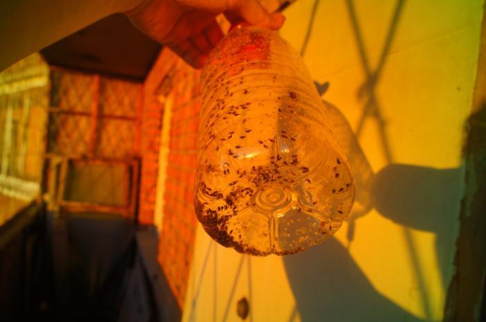 Соорудил такую ловушку для летающих насекомых из двух пластиковых бутылок. Ею нужно махать в форме восьмерки.