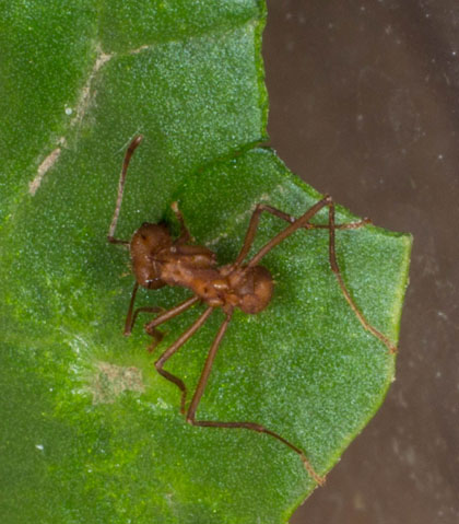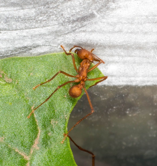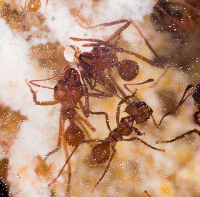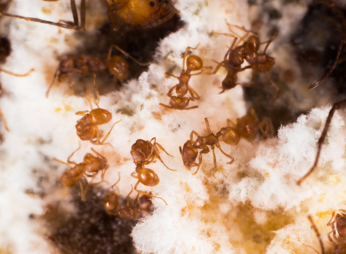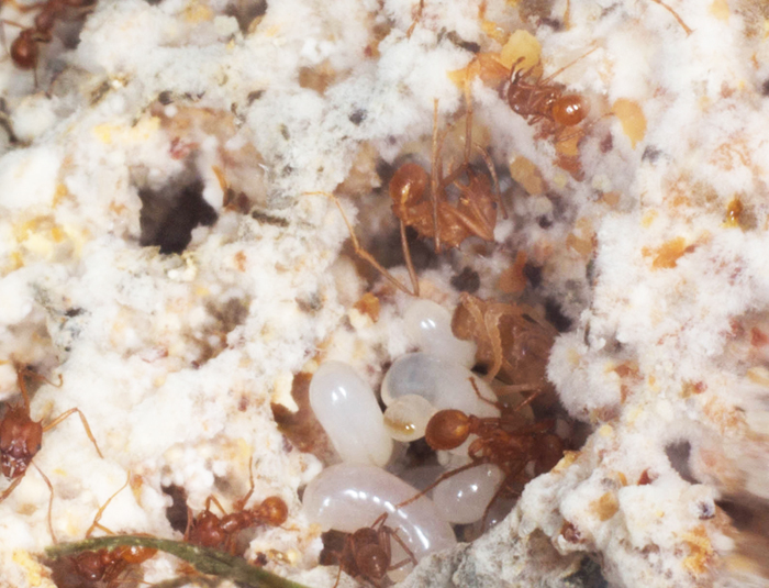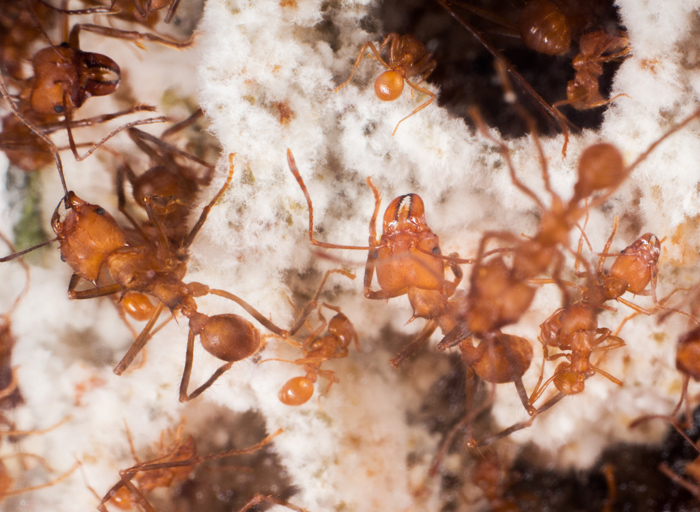 Основные ухаживатели гриба. Даже не знаю, имеют ли они какое-то отношение к работам с листовой массой. Мелкие (чуть крупнее тетрамориума), но довольно интересные особи. Такое ощущение, что остальные их просто не замечают из-за размеров. Составляют довольно весомый кусок рабочей силы. В какую сторону гриба ни плюнь - везде сидят кучки этой мелочи.
