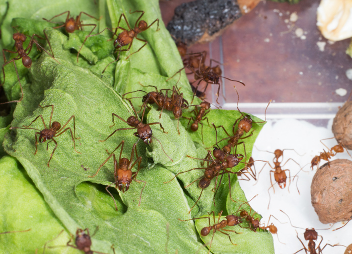 Секрет кормления листорезов зимой кроется в... шпинате! Почему именно в нем? Считаю его самой нейтральной нашей зеленью. Любая другая зелень используется нами в виду какого-то специфического вкуса, а шпинат более-менее нейтрален. Есть еще салатный лист, но его не пробовал. Слишком уж он тонкий. Чтобы таким выстроить нормальную грибную стену, нужно много листвы, а шпинат толстый, мясистый, из него просто строить. Кстати, в мясистости листа кроется еще один плюс - там много влаги. Листы шпината при разделке дают в воздух больше влаги, чем другие корма. Тем самым лучше поддерживается влажность в микроклимате. Сейчас уже проблематично открывать крышку, всю зелень кладу муравьям на арену.