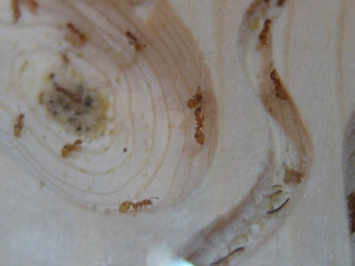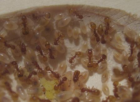 Рост численности колонии, надеюсь, остановился. Сейчас я пытаюсь их переселить в новый формикарий ... внешние размеры которого несколько меньше, а площадь камер, ходов ... на первый вгляд такая же ... . Надеюсь тесно не будет. Переселение, правда, идет совсем неважно. 30 часов под лампой - ничего не дали: муравьи лишь перенесли расплод из 2 камер на встроенную арену. Лампу отключил ... буду думать о других способах. В прошлый раз частично помогло увлажнение камер - лепты не любят влажную древесину и сразу ретируются из "затопленных" камер.