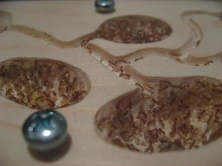 Процесс переселения муравьев затянулся. На третьи сутки почти беспрерывного обогрева/освещения формикария лампой в новом формикарии все еще было не более 30 муравьев (по сравнению с общим их числом - капля в море). Успехи были относительные - муравьи освободили почти все камеры, кроме одной, в которой обособленная группа муравьев даже и не думала куда-то уходить, не обращая внимание на жару. Все остальные муравьи (матка в том числе) при этом, прочно обосновались на внутренней арене - этакий коврик из нескольких слоев муравьев и расплода. Ну хоть так! Уже пол дела.