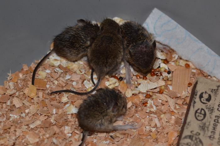 Принес я их домой и поселил в переноску для грызунов. У меня декоративные крысы живут. В крысиной клетке расстояние между прутьями для них очень большое. Насыпал овсянки, зерна которым кормлю жнецов, кинул немного гамаруса, налил воды в пробку от пластиковой бутылки, положил спичечный коробок и пачку от сигарет для укрытия: мелкие, размером с майского жука. Весь вечер первого дня они сидели и ели овсянку. Потом стали прятаться (мыши же). Такие забавные, подходишь к их жилищу, и если они не в "домике" то замирают и ждут (ага, серые мыши на фоне опилок). В руки даются с неохотой, теперь накормленных их надо ловить. Но что удивительно, если мышонок сидит на ладони, то убежать не пытается. На руке им сидеть нравится.