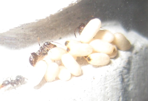 Муравьев по-прежнему трое, коконов уже 10, большое количество новых яиц. Думаю, что через месяц, когда будет муравьев 10, произойдет качественный скачок в увеличении колонии.
