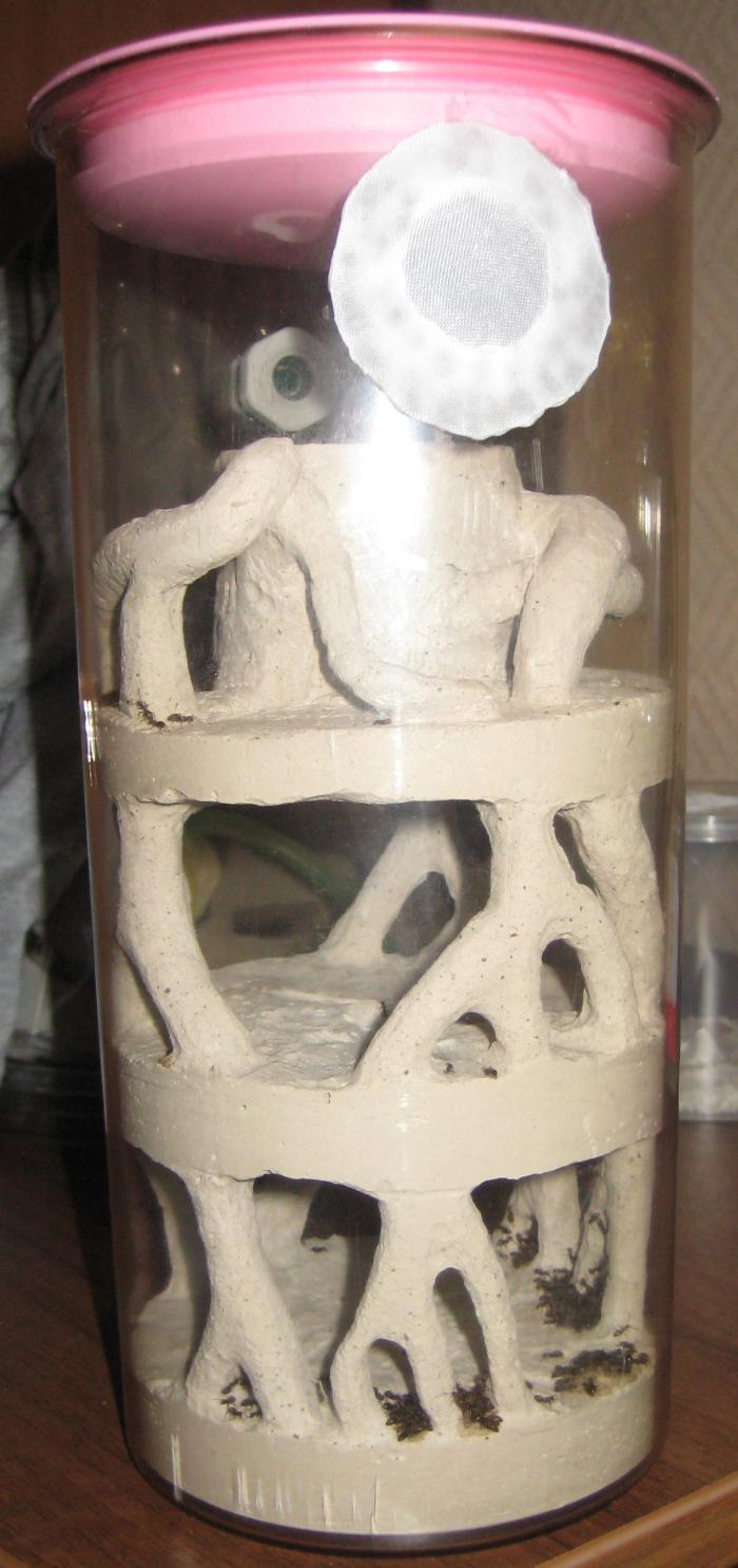 Утром обнаружил, что матка, большая часть муравьев, весь расплод и куколки - уже в новом формике. Оставшихся вечером переселил вручную. Матка с расплодом облюбовали самый нижний этаж. Сидят очень плотными кучами (друг на друге), им нужно время, чтобы стресс прошел. Дал им вареную креветку - едят. Немного увлажнил формик (до 80-90%). Но вентиляция хорошая - отверстие 18мм, а напротив еще одно - трубка для переселения, затянутая сеткой. Вот фото: