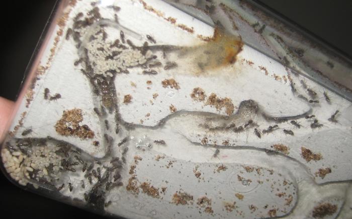 Ну, кажись освоились в новом формике, покормил не самими креветками, а их икрой, икра креветок, отварная, принята на ура, разтаскана по икринкам и отнесена к расплоду. Прикольно смотрится расплод, украшенный сверху икрой)))