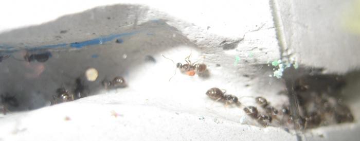 Колония растет не так быстро, как хотелось бы. Выявлены проблемы плесени (на фото под муравьями видно), плита неплотно прилегает к стеклу с обратной стороны, что уже привело к гибели более 10 муравьев. Скорее всего приму решение выселить муравьев из формикариума и самому залить новый гипс.