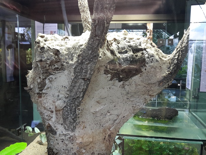 Экофиллы. Общий вид и жилое гнездо. Дерево окружено водой, и большинство гнёзд на нём сухие и, видимо, не обитаемые. Видны трубки, где бегают Акры. Зачем-то сделали для них верёвку, где они висят гроздьями.