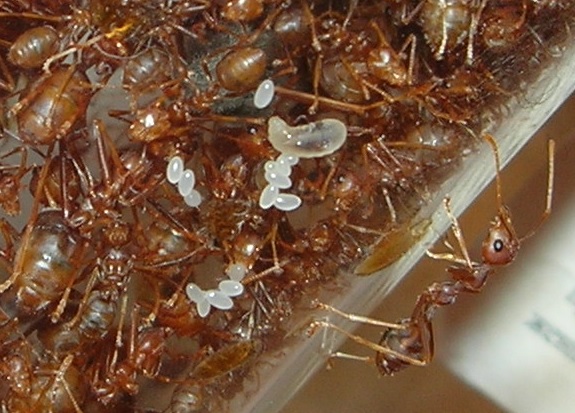 Количество яиц постепенно увеличивается. Здесь я насчитал около 30 штук. Муравьи их постоянно перекладывают, то кучкой, то раздельно, как на фото.