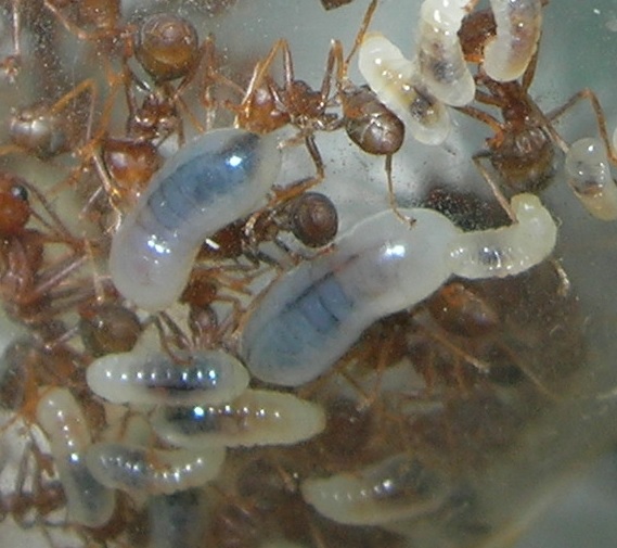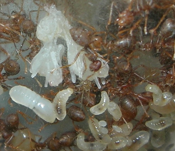 У моих экофилл до сих пор полно самцов, и я обратил внимание, что некоторые из них стоят голова к голове. Раньше я предполагал, что они или обмениваются пищей, как это делают рабочие, или дерутся. Сейчас пришёл к выводу, что это второе. Некоторое время назад я потянул одного из самцов из пары, и они не расцепились. Не знаю, кто кого держал, но второй, как не цеплялся ногами, был вынужден тащиться за первым. Дальнейшие мои наблюдения укрепили эту мысль.