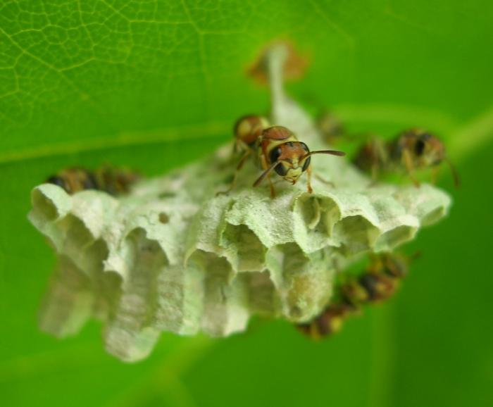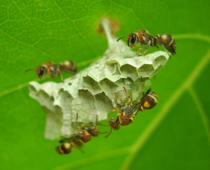В этом сентябре я снова посетил Таиланд. Помимо прочего я там обнаружил гнездо маленьких ( около 1 см ) ос. Что удивительно, гнездо находилось на большом листе какого растения. У этих ос необычная манера - они держат крылья под брюшком.